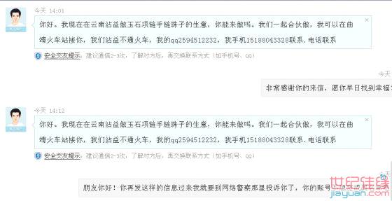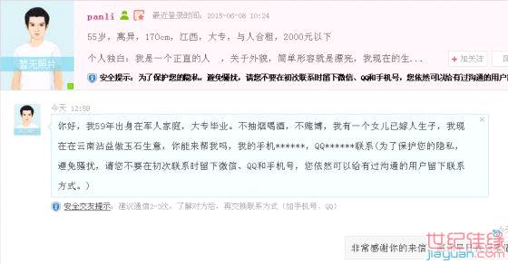 今天下班早就打开世纪佳缘看看,有这样一封信,要我跟他去云南一起做玉石生意,我礼貌回绝了,他又一而再、再而三的发消息过来,最后还是跟他说“你再发这样的信过来我就要报警了”他才没有继续发来。请姐妹们不要上这个叫“panli”的当。世纪佳缘是一个严肃认真的征婚交友平台,我也是诚心来找老伴结婚过日子的。请各位男pian、女pian们不要进世纪佳缘来污染环境!各位兄弟姐妹们也要多多注意,以免被那一部分有不良企图的骗。